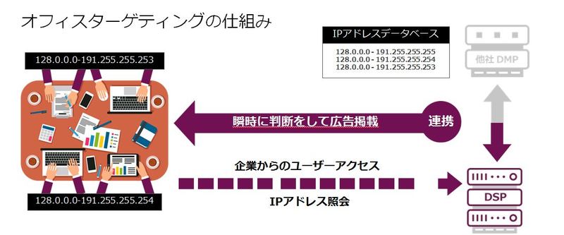 企業や大学、官公庁等は固有のIPアドレスを保有します。このIPと企業属性データを結び付け、対象企業のネットワークからのアクセスに対してのみ広告を表示します。